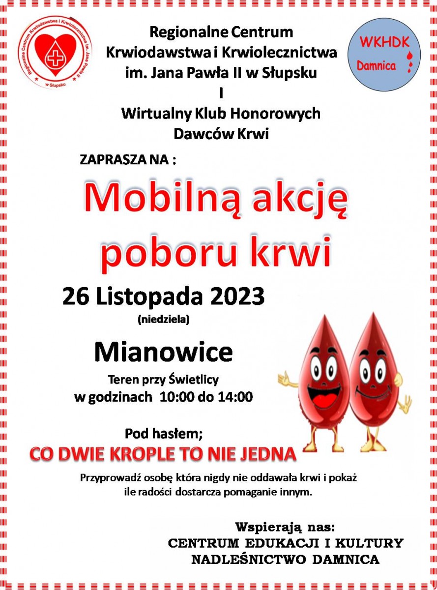Organizatorzy czekają na osoby gotowe oddać krew, w Mianowicach, w niedzielę 26 listopada br. w godzinach od 10:00 do 14:00 na terenie świetlicy wiejskiej.