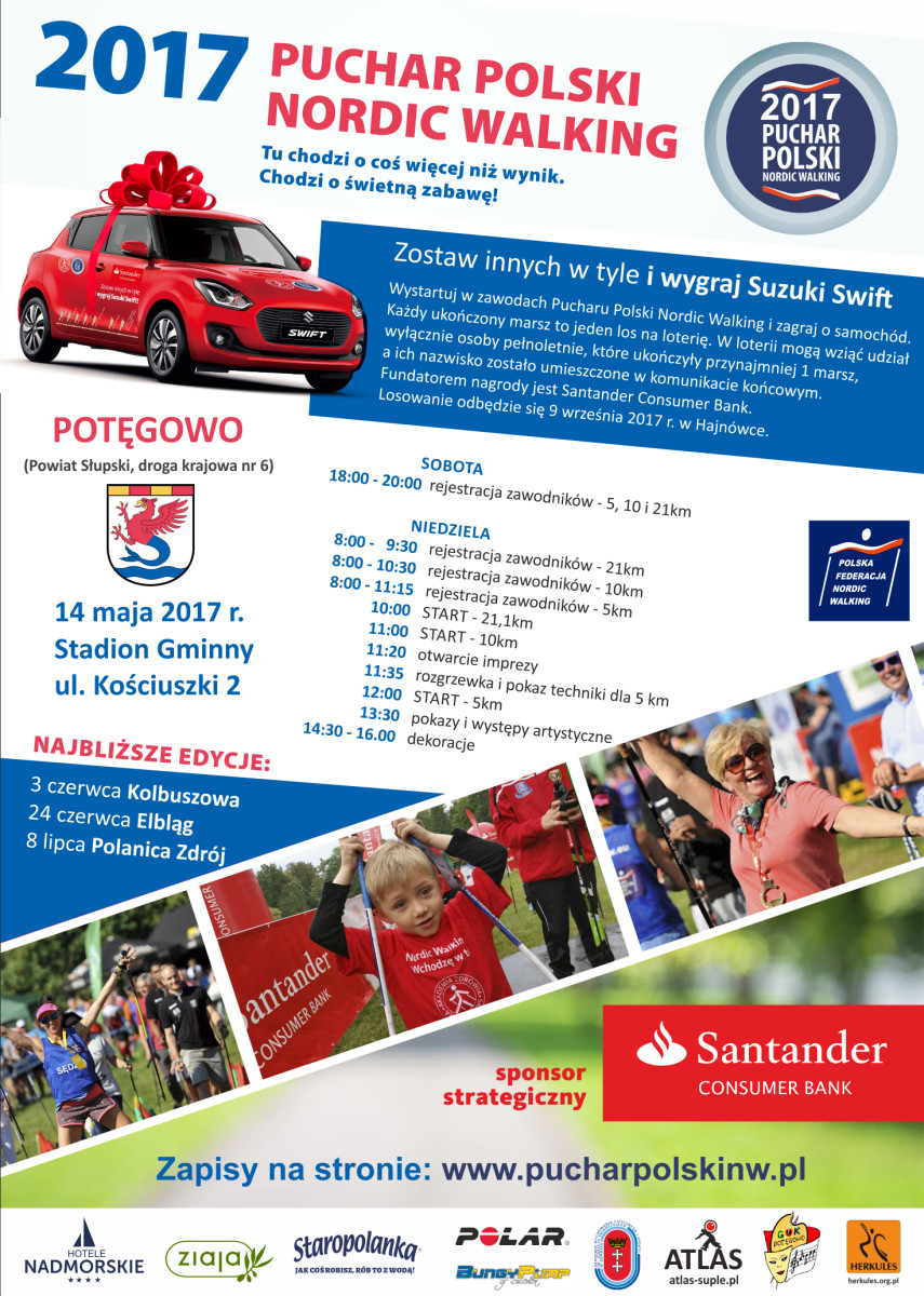 Niedzielne zawody są jednym z kilku wydarzeń tej rangi organizowanych przez Polską Federację Nordic Walking. Podczas Pucharu Polski w Potęgowie, zawodnicy będą rywalizować na trzech dystansach: 21,1 km, 10 km oraz 5 km. Wszyscy uczestnicy wezmą udział w losowaniu samochodu osobowego SUZUKI SWIFT, ufundowanego przez Santander Consumer Bank. Chęć udziału w imprezie można zgłosić na stronie: http://pucharpolskinw.pl/pucharpolskinw/