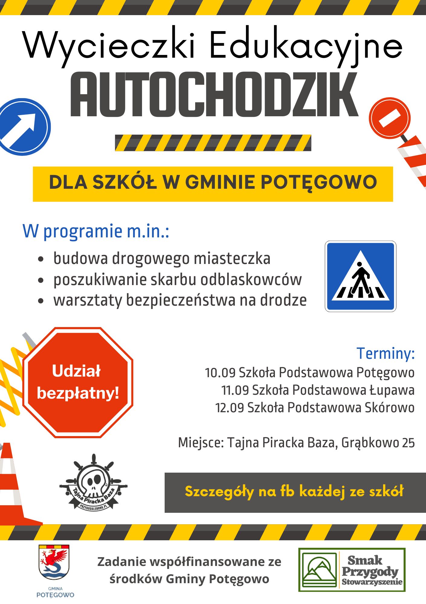 W ramach projektu, organizowanego przez Stowarzyszenie Smak Przygody , dzieci ze szkół w Potęgowie, Skórowie i Łupawie będą uczestniczyć w wyjątkowych warsztatach, gdzie: Nauczą się bezpiecznych zachowań na drodze, Zbudują drogowe miasteczko, Odgadną odgłosy ulicy, Stworzą własne znaki drogowe