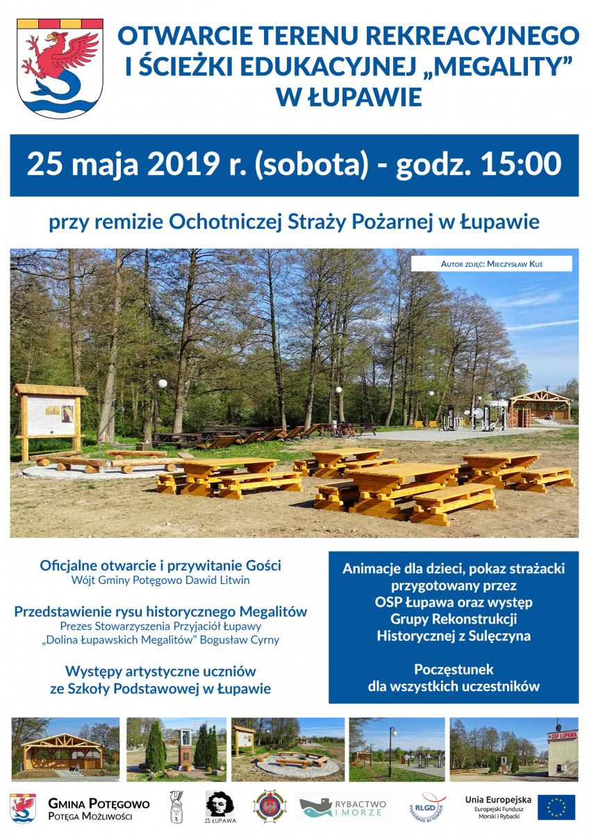 Wójt Gminy Potęgowo serdecznie zaprasza na oficjalne otwarcie nowego terenu rekreacyjnego oraz ścieżki edukacyjnej MEGALITY, które odbędzie się 25 maja 2019 r. - początek o godz. 15:00 przy remizie Ochotniczej Straży Pożarnej w Łupawie.