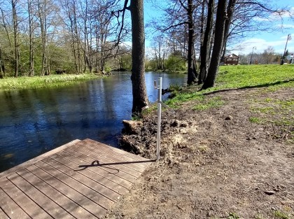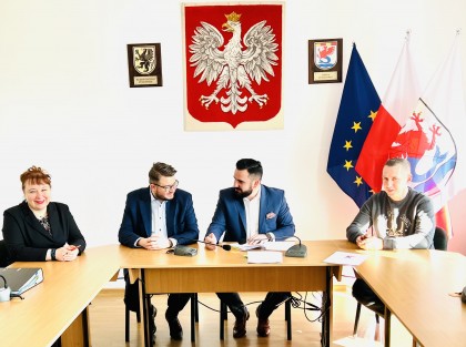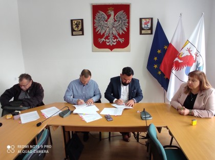 od lewej: z-ca Wójta Anna Boniecka, Skarbnik Gminy Dorota Majchrzak, przedstawiciel BGK Michał Maliński, Wykonawca Artur Chadacz, Kierownik Referatu Katarzyna Kozioł; w tle godlo państwowe, herb Gminy i Województwa Pomorskiego oraz flagi