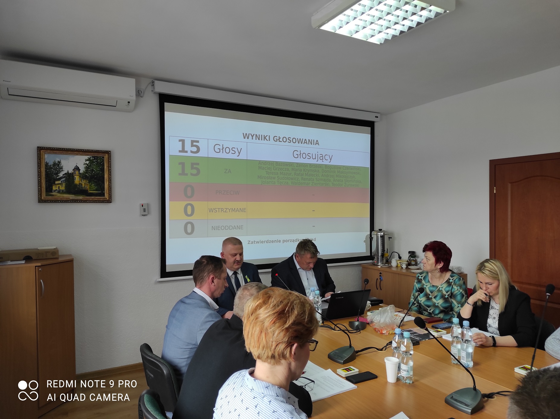 radni przy stole konferencyjnym, ekran z wynikiem głosowania