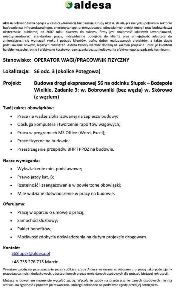 Miejsce pracy: 76-230 Potęgowo, ul. Targowa 5